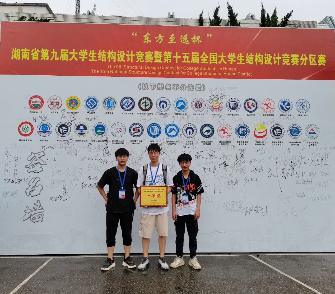 (文/土木工程学院 秦红禧)2022年6月17日至19日,湖南省第九届大学生结构设计竞赛暨第十五届全国大学生结构设计竞赛分区赛在湖南农业大学隆重举行,我院学子不惧压力、奋勇拼搏,在全省来自33所高校的96支队伍当中脱颖而出,斩获一等奖1项、三等奖3项、“创意美观奖”1项的优良成绩。其中,杨凯文、李毅、黄进才(指导老师:秦红禧)荣获一等奖;蒙姚姚、乔楷然、胡广(指导老师:袁健),郑敏炜、陈开拓、周蕴奇(指导老师:秦金旗)以及卢彦丹、范陈凡、朱运喜(指导老师:袁智深)荣获三等奖。此外,卢彦丹组还荣获创意美观奖。