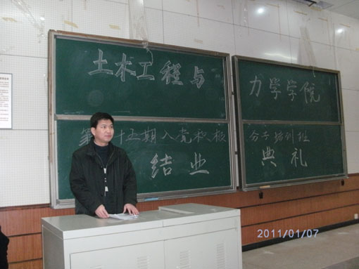 2011年1月7日下午,土木学院第四十五期入党积极分子培训班结业典礼在生科楼001举行。出席典礼的有土木工程与力学学院党总支副书记兼分党校副校长蒋炳春、副处级组织员余峰、分团委书记兼四十五期入党积极分子培训班班主任肖祥。结业典礼由王锦老师主持。