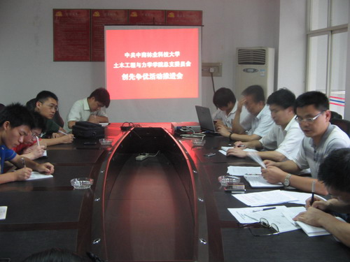 根据中共湖南省委办公厅转发《省委组织部、省委宣传部关于在党的基层组织和党员中深入开展创先争优活动的实施意见》通知精神和省委教育工委的统一部署,按照中共中南林业科技大学委员会深入开展创先争优活动实施方案要求,我院党总支于2010年7月6日中午13:00在学院会议室召开创先争优活动推进会,学院总支书记刘梦飞,副书记蒋炳春,组织员余峰以及各支部书记参加了会议。会议对我院推进创先争优活动进行了详细安排。并要求各支部及党员本周提交公开承诺书并公开张贴。全院党员掀起一股创先争优活动的热潮。