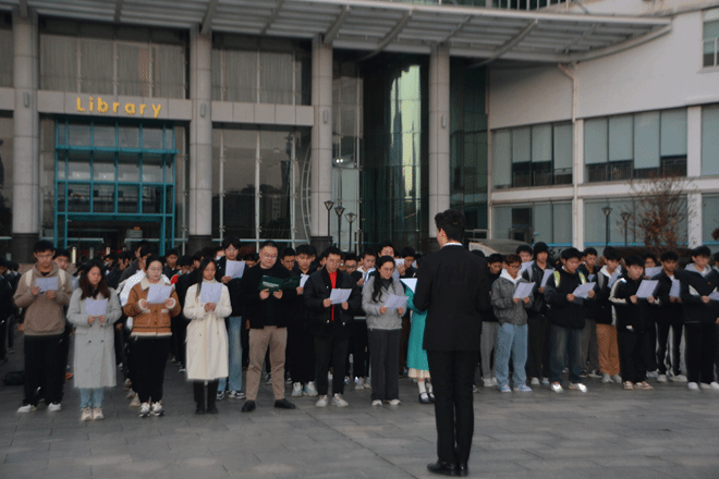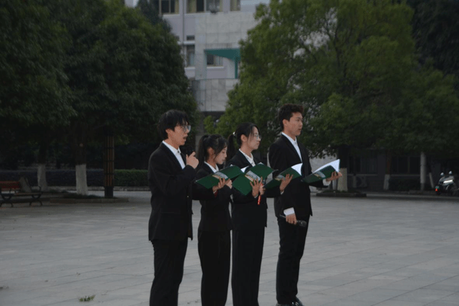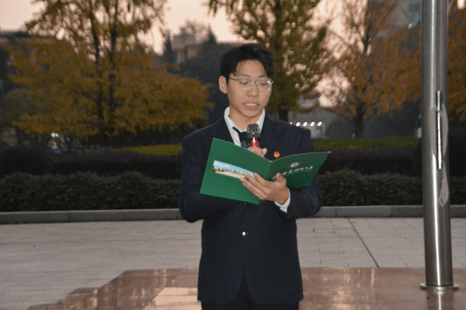随后,全体师生诵读梁启超先生的《少年中国说(节选)》,在领诵员肖业衡的带领下,齐诵声汇聚成力,响彻广场。今年恰逢新中国成立75周年,学院主持队朗诵《写给我深爱的祖国——山河颂》,并带领全体同学庄严宣誓,“……不负学校培养,不负国家期望,为实现中华民族伟大复兴的中国梦不懈奋斗。”深切话语化为祝福,共同祝愿祖国繁荣昌盛!