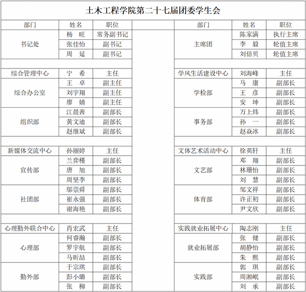 岁月如梭,人事更迭,为进一步在团委学生会干部队伍注入新鲜血液,本着“公开选拔,公平竞争,择优录取”的原则,我院举行了第二十七届团委学生会换届竞选大会。经前期个人报名、工作表现、现场演讲等环节,学院团委研究决定,聘任杨旺等48名同学为第二十七届团委学生会干部,具体名单如下: