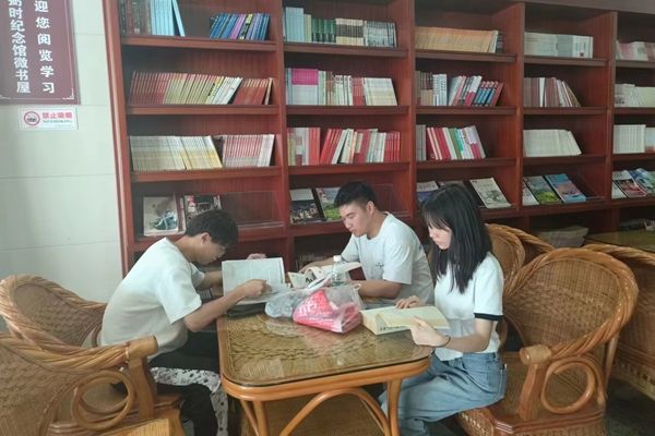 在任弼时纪念馆茶室,中南林业科技大学土木工程学院赴岳阳市汨罗市新塘乡“入乡文化传承,助力乡村振兴”乡村振新促进团集体组织阅读红色书籍。团队成员都在书架上挑选了感兴趣的书籍进行翻阅。由于行程问题,阅读时间较为短暂。但大家都聚精会神对红色书籍进行仔细研读。