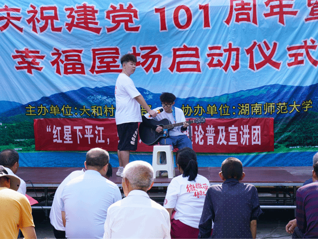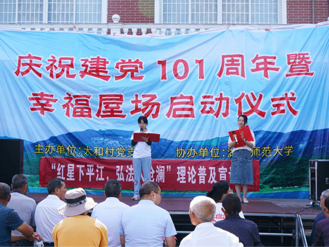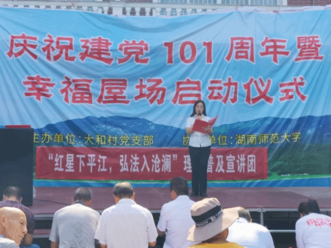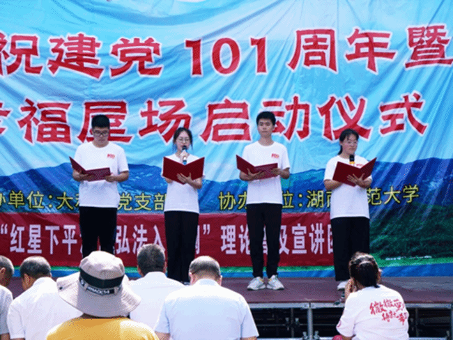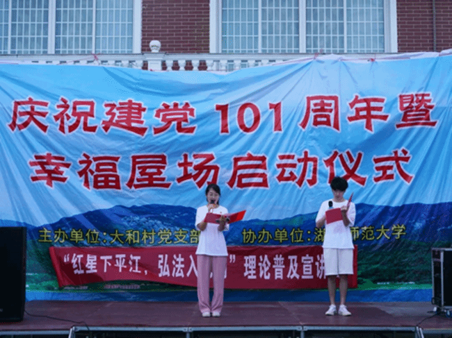 6月27日上午,中南林业科技大学土木工程学院“红星下平江,弘法入沧澜”理论普及宣讲团与大和村支部、湖南师范大学旅游学院一起联合开展了福寿山镇大和村庆祝建党101周年暨幸福屋场启动仪式。福寿山镇副镇长彭台甫,大和村党支部书记陈北斗及大和村支村两委全体成员出席了本次启动仪式,仪式由大和村党支部妇女主任邱辉辉、中南林业科技大学土木工程学院鲁洪美共同主持。
