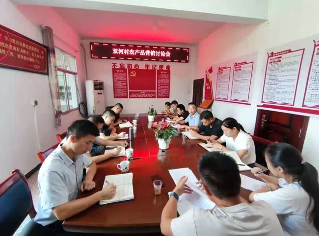 下午14时,双河村召开了双河农产品销售讨论会。镇长吴山川,副镇长戴奎,巷子花开董事长易建,驻双河村第一书记唐江波,双河村党总支书记,村委会主任唐翔宇,党总支副书记、团支部书记彭彬出席了此次会议,实践团成员应邀参与本次会议。