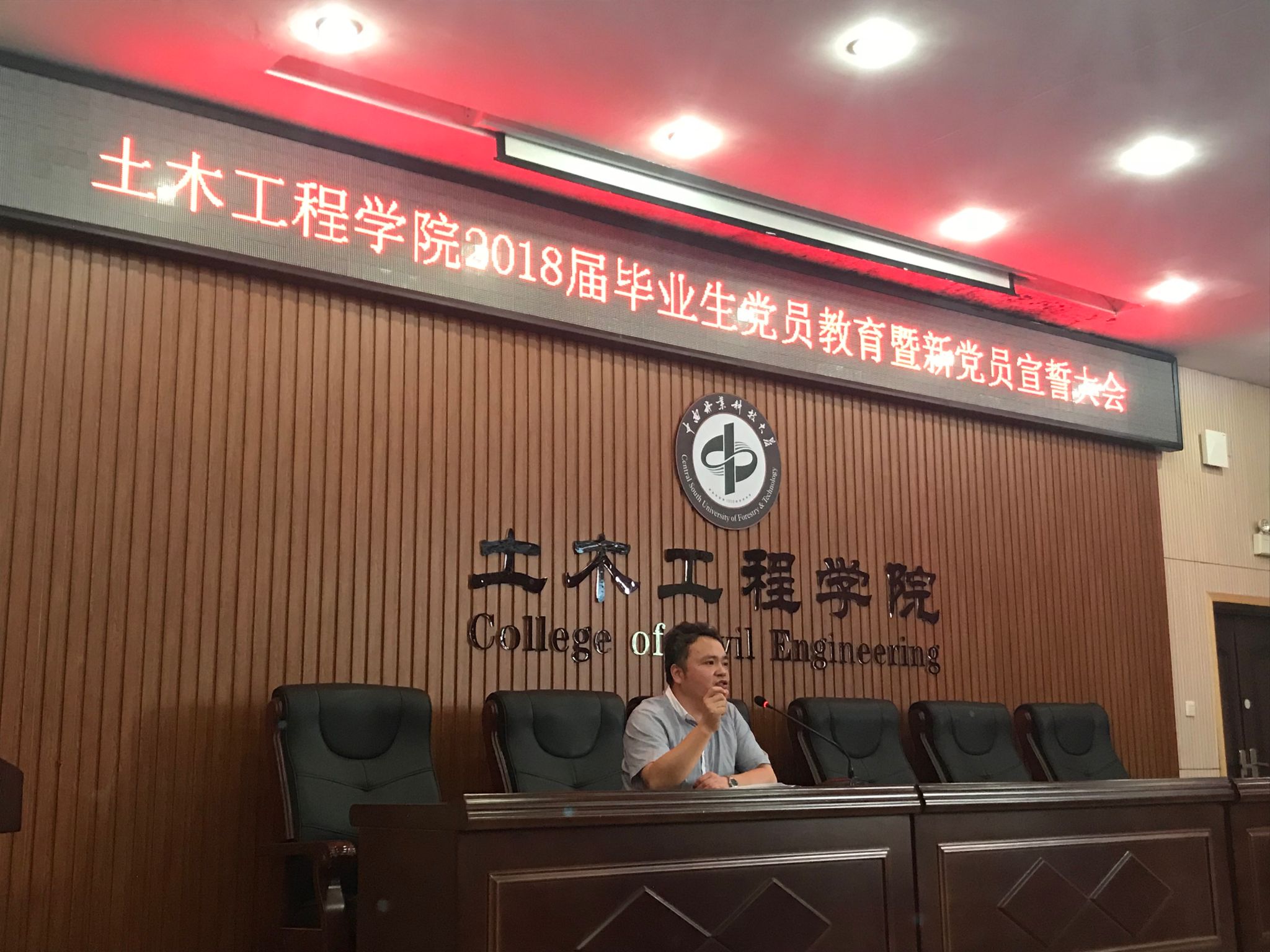 大会在庄严的《国歌》声中顺利拉开序幕。旭章宣读2018年上半年被接收的46名预备党员名单后,由毕业生党员潘佳莉同志带领宣誓,全体毕业生党员以及新发展的预备党员面对党旗宣读了入党誓词,在铿锵有力的誓言中,深切地感受到新老党员对党的忠诚和决心。随后,张琼宣读《致毕业生的一封信》,表达对所有毕业生党员的良好祝愿,同时就相关注意事项做了说明。紧接着,毕业生党员代表黄琪敏、在校生党员代表段阳宇发言。在他们的发言中,既有对时光飞逝的感叹,也有对母校的不舍和祝愿。之后,易锦以“不忘初心,传承校训”为题,给全体毕业生党员上了一堂党课。他指出,所有毕业生党员入学四年(三年)以来,与母校共同成长和发展,土木工程专业复评估认证和本科教学工作审核评估留下了大家奋斗的汗水;“求是求新、树木树人”的校训是我们全体师生共同的行为准则和价值追求;所有党员同志要从”为什么加入中国共产党”这个入党动机根本问题入手,时刻“不忘初心,传承校训”。同时,他以“忠诚、博识、卓越、勤奋、感恩”十个字寄予对所有党员同志及同学们的期望,期待所有毕业生党员常回母校看看。最后,吴海刚对本次会议进行了总结,要求每一位党员同志都应当坚守信念,勇于担当。