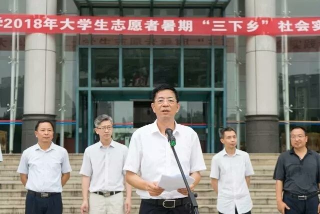 首先,校团委书记李凯介绍了本次“三下乡”活动的筹备情况。随后,研究生部部长张仕吉宣读了本次社会实践活动团队名单,参加活动的领导为重点团队授旗。之后陈冬林副校长发表讲话。他指出“青春贵磨砺,实践出真知”,希望同学们抓住这次社会实践机会,提升自己、服务社会。最后,他宣布我校2018年暑期大学生“三下乡”社会实践活动正式启动。