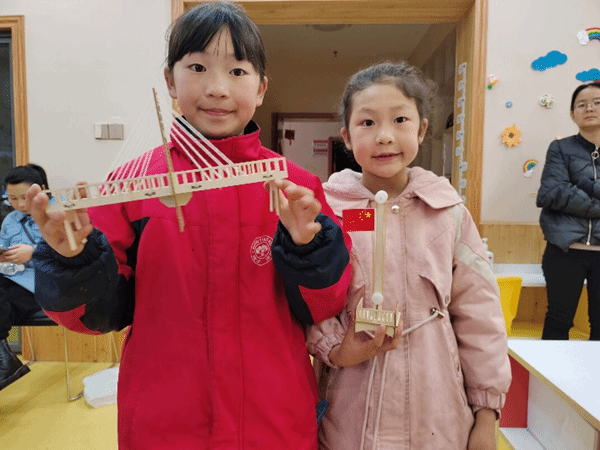 课堂上,“公益老师”们通过精美视频展示和模型实物讲解的方式,引导孩子们理解建筑工程原理和内在美学。在指导制作升旗台和斜拉桥模型的实践过程中,让小朋友在玩乐中提升创造力和想象力,培养实践能力和团队合作意识。“老师,看我的作品!未来我也要当工程师。”一位小朋友兴奋地举起自己拼接制作的模型,赢得满堂喝彩。