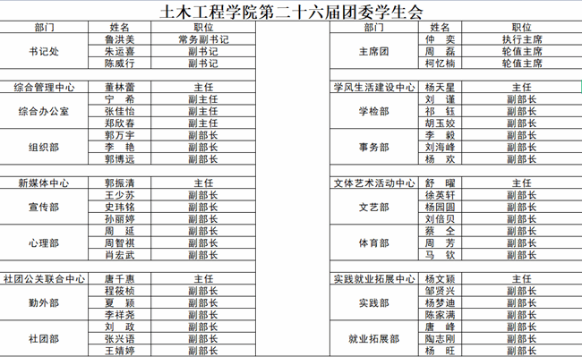 时光荏苒,人事更迭,为进一步壮大团委学生会干部队伍力量,本着“公开选拔,公平竞争,择优录取”的原则,我院举行了第二十六届团委学生会换届竞选大会。经前期个人报名、工作表现、现场演讲等环节,学院团委研究决定,聘任鲁洪美等48名同学为第二十六届团委学生会干部,具体名单如下: