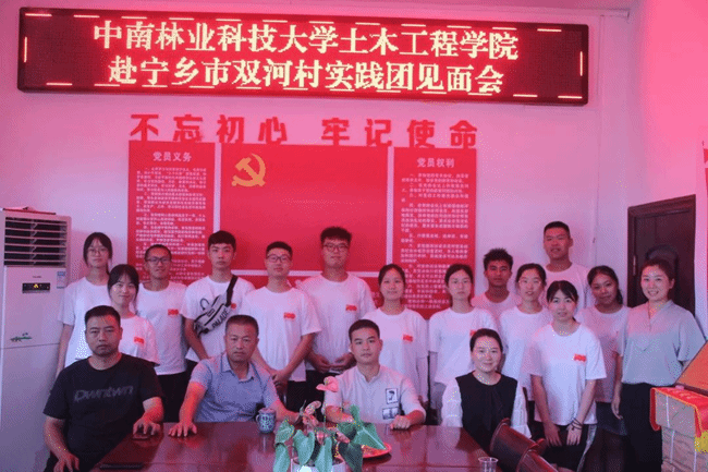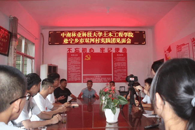7月10日傍晚时分,社会实践团抵达双河村,并与当地村委会举行了“中南林业科技大学土木工程学院赴宁乡市双河村实践团见面会”。双河村党总支书记、村委会主任唐翔宇,党总支副书记、团支部书记彭彬,党总支委员彭敏,团支部组织委员彭赛群,团支部宣传委员龚湘云出席了此次会议。