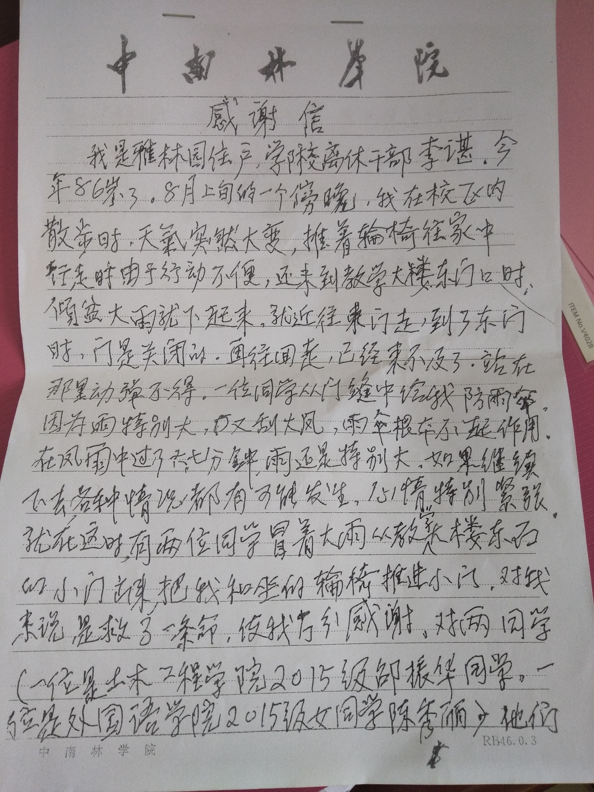 李湛教授在感谢信中写道,在今年8月上旬的一个大雨滂沱的傍晚,于万分危急的时候,他受到了来自土木工程学院2015级邵振华同学和外国语学院2015级陈秀丽同学的帮助。李湛教授以及他的家人万分感谢,故希望学校能给予两位同学表扬,让更多人能了解两位同学的善良。
