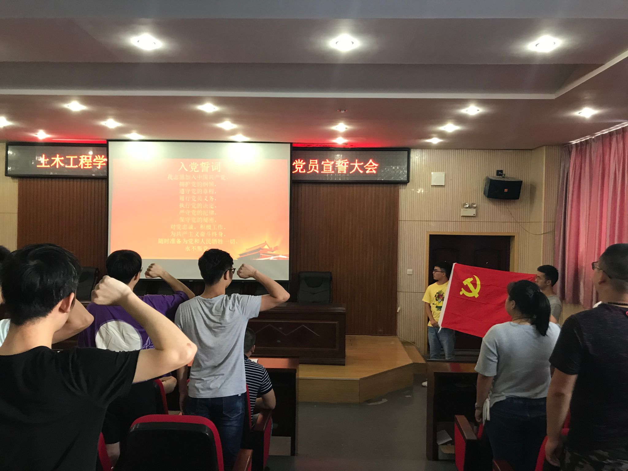大会在庄严的《国歌》声中顺利拉开序幕。姜旭章宣读2018年上半年被接收的46名预备党员名单后,由毕业生党员潘佳莉同志带领宣誓,全体毕业生党员以及新发展的预备党员面对党旗宣读了入党誓词,在铿锵有力的誓言中,深切地感受到新老党员对党的忠诚和决心。随后,张琼宣读《致毕业生的一封信》,表达对所有毕业生党员的良好祝愿,同时就相关注意事项做了说明。紧接着,毕业生党员代表黄琪敏、在校生党员代表段阳宇发言。在他们的发言中,既有对时光飞逝的感叹,也有对母校的不舍和祝愿。之后,易锦以“不忘初心,传承校训”为题,给全体毕业生党员上了一堂党课。他指出,所有毕业生党员入学四年(三年)以来,与母校共同成长和发展,土木工程专业复评估认证和本科教学工作审核评估留下了大家奋斗的汗水;“求是求新、树木树人”的校训是我们全体师生共同的行为准则和价值追求;所有党员同志要从”为什么加入中国共产党”这个入党动机根本问题入手,时刻“不忘初心,传承校训”。同时,他以“忠诚、博识、卓越、勤奋、感恩”十个字寄予对所有党员同志及同学们的期望,期待所有毕业生党员常回母校看看。最后,吴海刚对本次会议进行了总结,要求每一位党员同志都应当坚守信念,勇于担当。