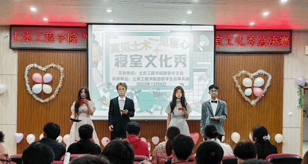 为营造我院温暖的寝室氛围,打造舒适的宿舍环境,12月8日晚上7:00,我院“寓见土木,一见寝心”寝室文化秀决赛在土木楼501报告厅隆重举行。2023级辅导员义子楚,2022级辅导员兼团委书记沈浙,第二十七届团学会全体成员及各班级代表参加了本此活动。