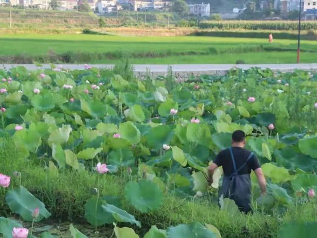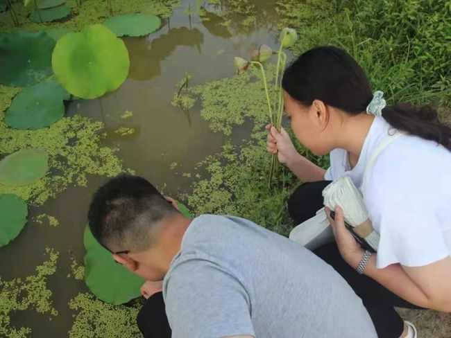 早上5:30,天刚刚亮,实践团成员应党总支委员彭敏邀约前往荷花池。彭敏向实践团成员们介绍,荷花池是在国家脱贫攻坚成功之后,支村两委带头承包,带动有志青年回乡创业。通过在空闲时间种植、出售产物的营业模式,达到发展第二产业成功致富的目的。双河村村民在支村两委的带领下都发展了第二产业,包括种植红薯、黄桃等,同时努力做到三产融合,实现了全村的脱贫致富。实践团成员认真听彭委员讲述了村里第二产业的发展特色,同时体验了摘莲蓬,尝莲子的乐趣。