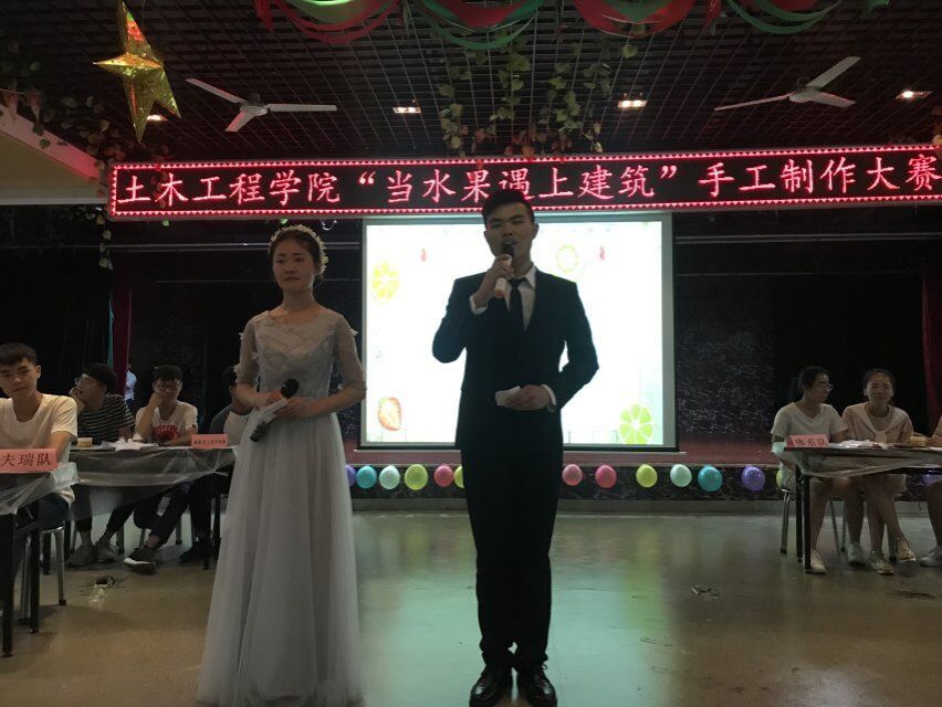 2018年5月11日晚7:00,我院“当水果遇上建筑”手工制作大赛在大学生活动中心成功举办。土木工程学院团委书记、2014级辅导员蒋龙老师,2017级辅导员邓云老师,校学生会副主席张警云,我院团委学生会主席团书记处成员担任了本次大赛的评委。