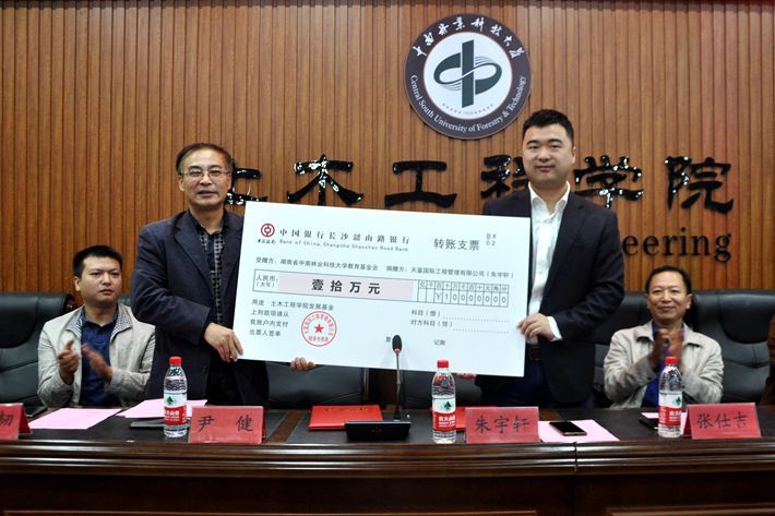 在随后进行的捐赠仪式上,我院2008届杰出校友、湖南天鉴国际工程管理有限公司第一直属公司总经理朱宇轩向土木工程学院发展基金捐赠10万元,用作土木工程学院的学科专业建设及发展,支持天鉴国际工程管理有限公司与学院教师广泛开展学术交流,进一步改善学科科研条件,奖励和资助土木工程学院优秀学子和贫困学生完成学业或科学研究等。会上,优秀校友朱宇轩作精彩发言,他代表天鉴国际工程管理有限公司第一直属公司向获奖学生表示祝贺,感谢母校的培养,同时鼓励同学们牢记时代赋予的社会责任,努力学习,健康成长,争取今后回报学校,回报社会。优秀校友郭效仪分享了自己多年的工作经历,希望在校师弟师妹们要勤奋认真学习,为学校争光,为民族振兴做贡献。