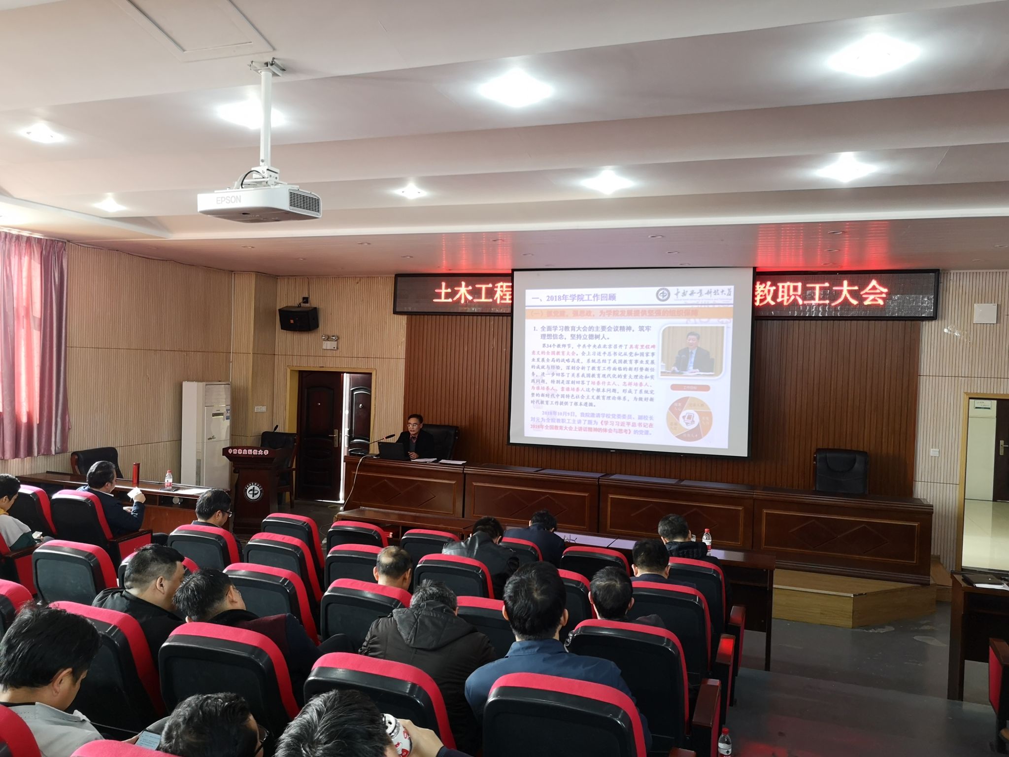 2019年3月12日14:30至16:00,我院在土木楼501学术报告厅召开了2019年春季学期第一次教职工大会,学院领导班子成员和全体教职员工参加会议。16:10至17:10,在土木楼603会议室举行了2018年度学院科级干部述职测评会,学院领导班子、系部主任和支部书记及教师代表共25人参会。两阶段会议均由院党委书记易锦主持。