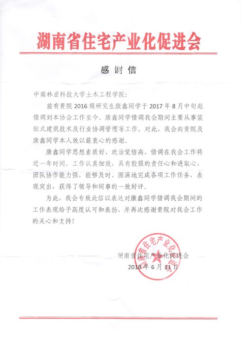 近日,我院收到了一封来自湖南省住宅产业化促进会发来的感谢信,信中对我院2016级研究生康鑫同学在实习期间的优异表现给予了高度认可和表扬。