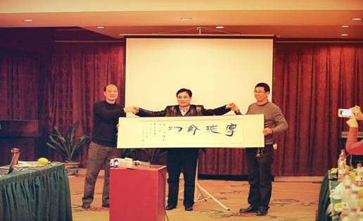 最后,校友们举行了为母校赠字画活动。95届校友集资为学院赠送“厚德载物”字画一副,以表达对母校的感恩,并与学院领导、老师合影留念。