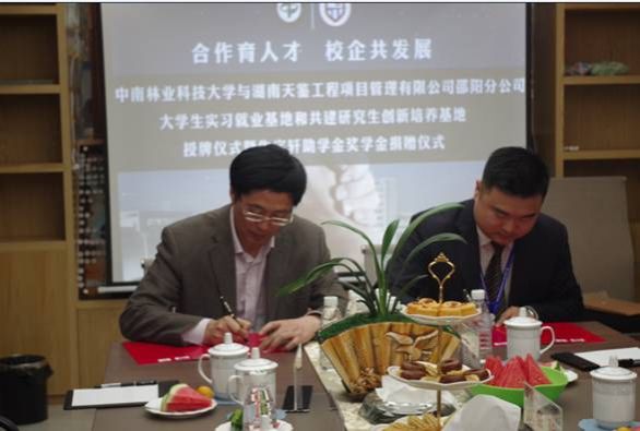 朱道弘副校长对于校企合作提出了“合作共赢”的期待,并双方签订了“中南林业科技大学-湖南天鉴工程项目管理有限公司邵阳分公司大学生实习就业基地”协议书和“中南林业科技大学-湖南天鉴工程项目管理有限公司邵阳分公司共建研究生创新培养基地”协议书。