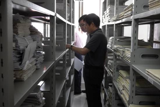 评估专家组成员、哈尔滨工业大学土木工程学院党委书记邹超英教授认真查阅教学档案Ⅰ