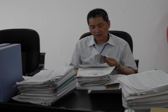 评估专家组成员、沈阳建筑大学土木工程学院常务副院长贾连光教授认真查阅教学档案Ⅰ