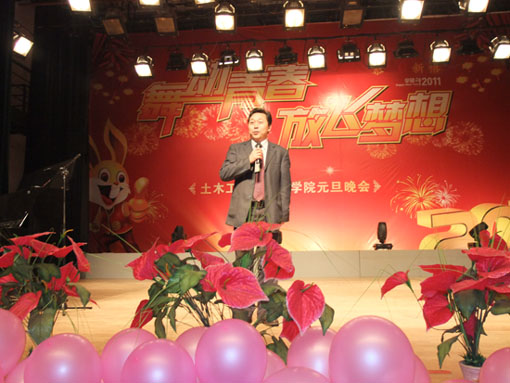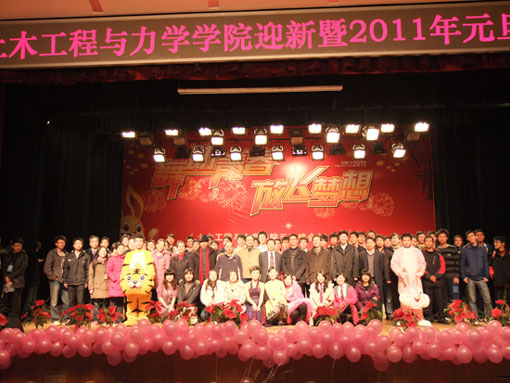 金虎欢歌辞旧岁,玉兔起舞迎新年。12月24日晚中南林业科技大学音乐厅流光溢彩,灯火辉煌,由土木工程与力学学院举办的迎新暨2011年元旦晚会在此隆重举行。中南林业科技大学副校长秦立春,党委宣传部部长陈晓文、党委组织部副部长唐鼐、学工部副部长欧阳洪毅等职能部门领导,“三智”电子科技公司黄总、杨总,土木工程与力学学院院长贺国京,党总支书记刘梦飞,副院长唐小弟,副院长王解军,党总支副书记蒋炳春,及部分教师代表应邀观看了演出,并与全体师生共贺节日,喜迎新年。