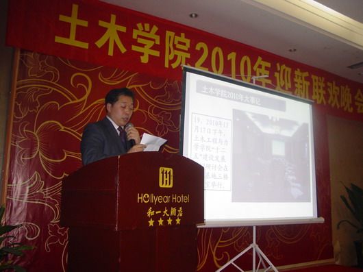 下午6点,在和一大酒店4楼雅和堂举行联欢晚宴。席间,贺国京院长发表新年致辞,向全体教职员工致以新年的良好祝愿和亲切问候,对大家一年来的辛勤工作表示衷心感谢。他指出,2010年是我院“十一五”发展规划的最后一年,也是我院首次实行目标管理的一年。在这一年里,我院在学科建设、科研成果、教学管理等方面均取得了优异成绩。同时希望我院全体教职员工共同努力,在2011年再创佳绩,把土木学院建设的更加美好。