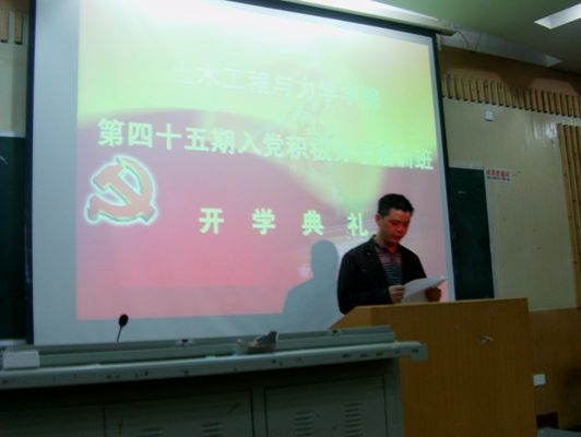 2010年11月21日上午,土木工程与力学学院第四十五期入党积极分子培训班开学典礼在经干一教学楼一楼阶梯教室隆重举行。出席开学典礼的领导有:学校党校专职副校长王红艳、学院党总支书记分党校校长刘梦飞、党总支副书记分党校副校长蒋炳春。开学典礼由学院副处级组织员余峰主持。